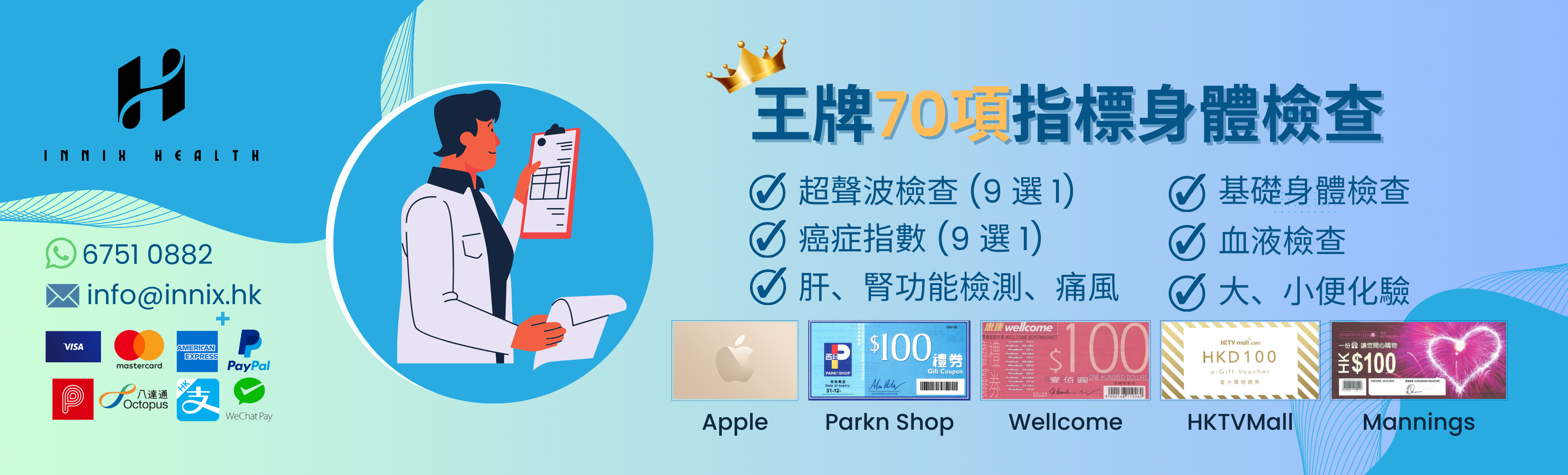 70項指標身體檢查 連9選1項癌症指數+8部位超聲波檢查 (送$100 Apple Gift Card / 超市禮卷) *接受Paypal/Visa/Master/AE/支付寶/微信/PayMe/八達通 付